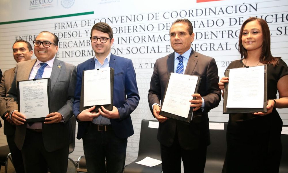 Morelia, Michoacán, a 7 de noviembre de 2017.- Para tener un impacto más focalizado de los programas sociales y de los sectores más necesitados de atención, así como contar con un padrón único de beneficiarias y beneficiarios, este martes fue firmado el Convenio de Coordinación entre el Gobierno del Estado y la Secretaría de Desarrollo Social (Sedesol) para el intercambio de datos dentro del Sistema de Información Social e Integral (SISI).