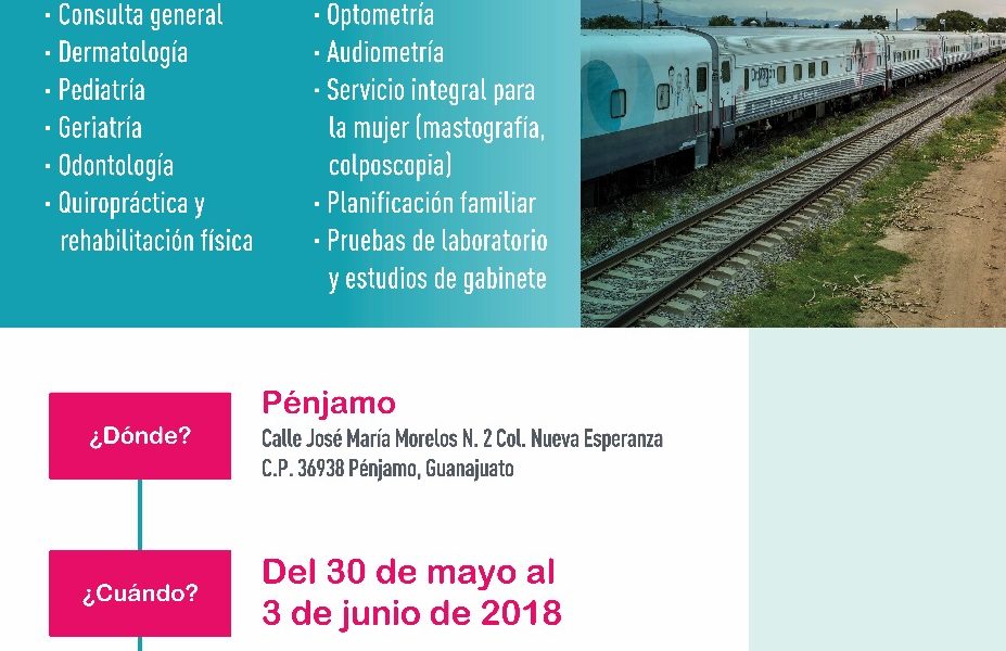 La próxima parada del Doctor Vagón “El Tren de la salud” será la comunidad de Estación Pénjamo, donde personas de todas las edades tendrán acceso a servicios de atención médica gratuita así como a disfrutar del CINE Vagón.