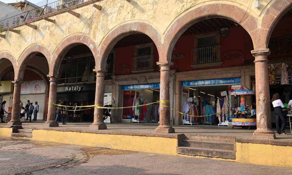 Debido a que una de las vigas que soportan parte de la estructura del techo del portal “Abasolo” ubicado en el centro de la ciudad tuvo desprendimiento de su base, personal de Protección Civil Municipal (PCM) decidió acordonar el área de riesgo para evitar accidentes.