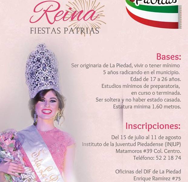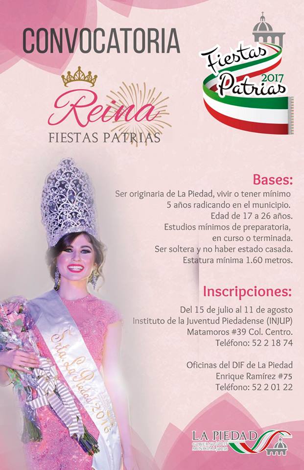 Los requisitos que deben reunir las aspirantes son: radicar en La Piedad, tener de 17 a 26 años de edad, escolaridad mínima de Preparatoria, ser soltera y no haber estado casada.