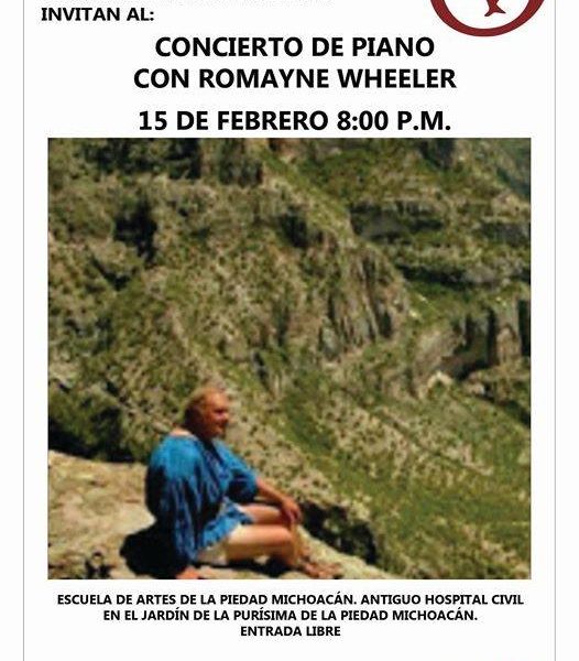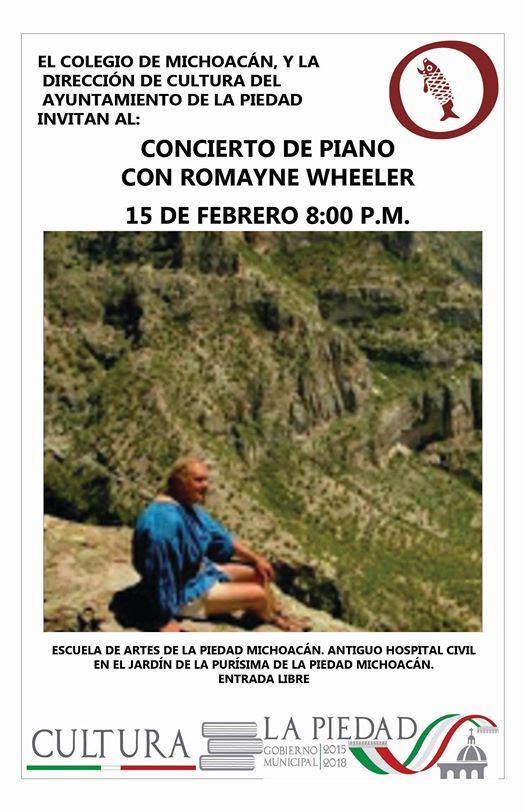 El Gobierno Municipal de La Piedad dirigido por Juan Manuel Estrada Medina a través de la Dirección de Cultura y en colaboración con el Colegio de Michoacán (COLMICH), hace una cordial invitación al público en general para que asista al concierto de piano que estará presentando Romayne Wheeler.