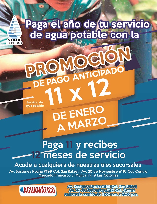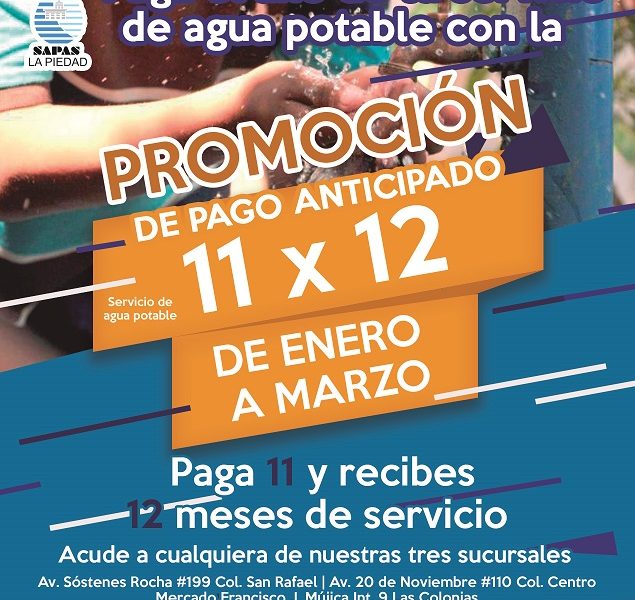 El Sistema de Agua Potable, Alcantarillado y Saneamiento de La Piedad (SAPAS) invita a sus usuarios a que aprovechen la promoción de pago anticipado 11×12 a partir de enero y hasta el mes de marzo.