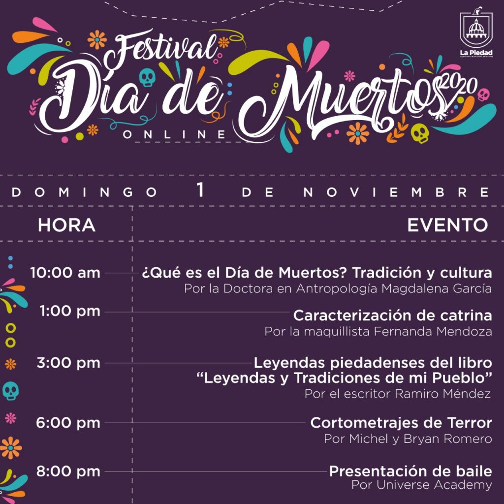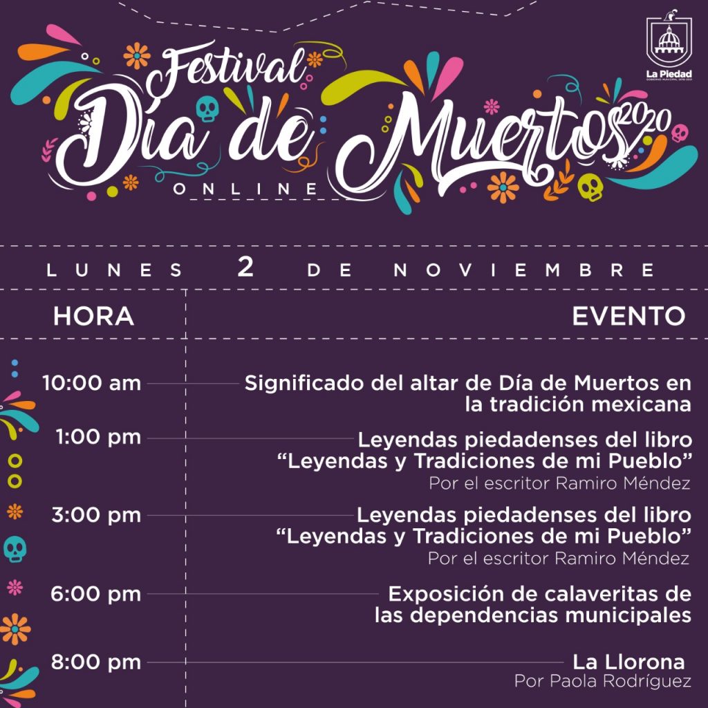 A las 13:00 horas se proyectará una caracterización de catrina por la maquillista Fernanda Mendoza; a las 15:00 horas se dará a conocer la primera de las leyendas piedadenses del libro “Leyendas y Tradiciones de mi pueblo” por el escritor Ramiro Méndez.