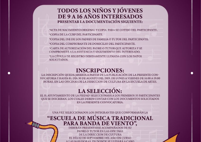 Interesados en formar parte de la banda de viento deben presentar: Acta de nacimiento original y copia; copia de la CURP; copia del INE de los padres de familia o tutores; comprobante de domicilio; carta de autorización del padre o tutor y cédula de registro debidamente llenada con los datos del solicitante.